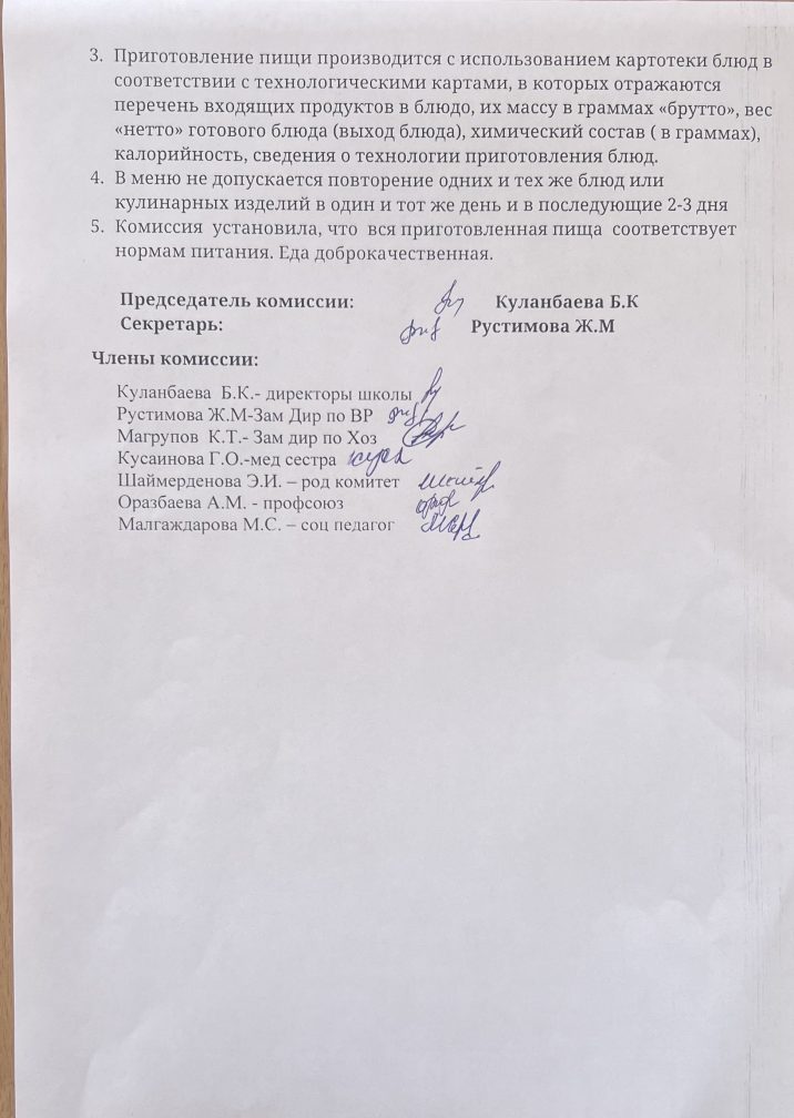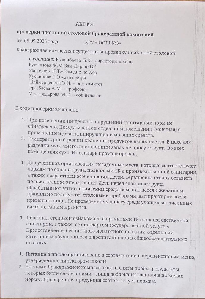 Бракераждық комиссияның мектеп асханасын тексеруі
